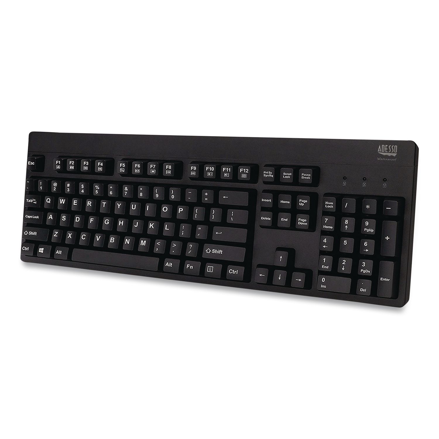 The Adesso® AKB-630UB Antimicrobial Waterproof Keyboard is the perfect desktop keyboard for users looking for a solid keyboard that will work in an environment potentially exposed to liquids, moisture, dust or germs, such as schools, restaurants, banks, medical clinics, offices, POS, industry and warehouse environments. This keyboard also features membrane keys switch for increased productivity along with multi-functional hotkeys that give you quick access to your internet and media player tools. Since the circuit board inside is sealed with a plastic material, this Adesso® Antimicrobial Waterproof Keyboard is 100% waterproof and can be cleaned with soap and water or other liquids cleaners. Ranked as an IP-67 Waterproof Standard, this device can withstand being submerged in water for up to 30 min up to a 3 ft depth. Wired/Wireless: Wired; Connector/Port/Interface: USB; For Device Type: Desktop; Laptop; Keyboard Design: Standard.