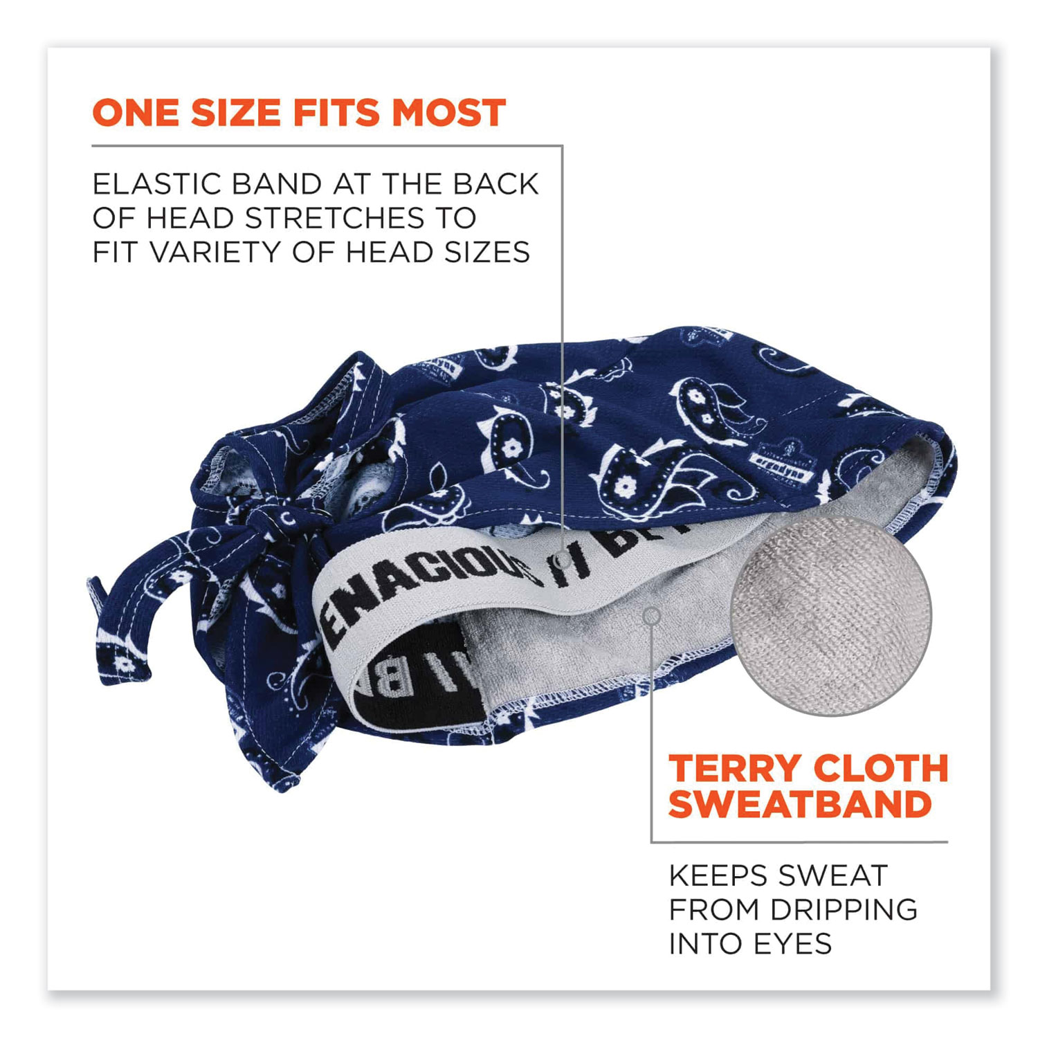 The Chill-Its 6615 High-Performance Bandana Doo Rag with Terry Cloth Sweatband is made with Hi Cool moisture-wicking technology to keep workers comfortably cool and dry on hot days. The Hi Cool performance fabric wicks moisture for quick-drying, while the absorbent terry cloth sweatband prevents sweat from dripping into eyes. This low-profile cooling doo rag can be worn alone or under a hard hat. One size fits most, the back features an elastic band that stretches to comfortably fit a variety of head sizes. To be worn correctly, the three pieces of fabric should also be tied in a knot. Machine wash as needed and hang to dry. Ideal for construction, landscaping, roofing or anyone working in the heat. It is also a great bandana headband for running, hiking and other recreational activities. Apparel Type: Cooling Hat; Material(s): Polyester; Color(s): Navy Western; Color Family: Blue.