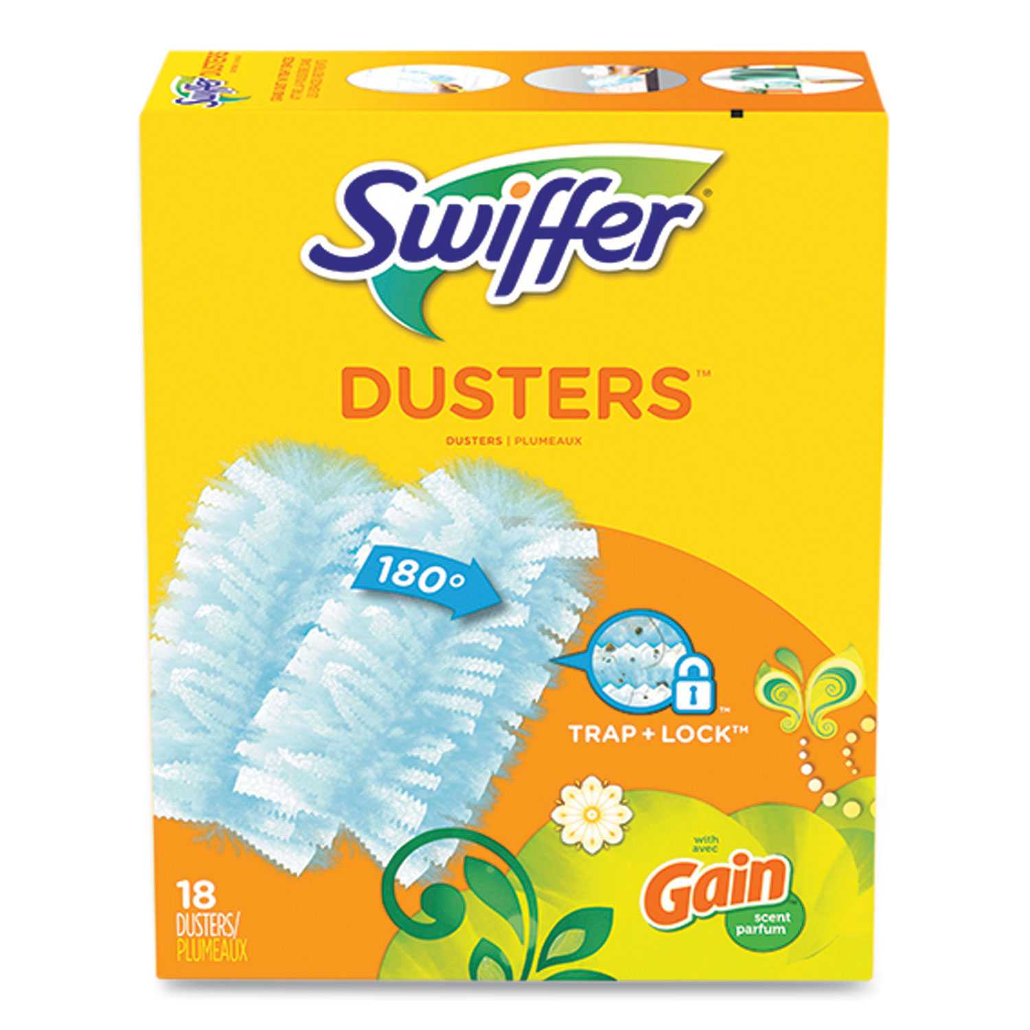 Swiffer Dusters TRAP + LOCK dust and common inanimate allergens from cat and dog dander and dust mite matter. Made with specially coated fibers that grab onto dust and don't let go. They are uniquely designed to Trap + Lock dust from even the tight spaces in your home or office. Bristle Material: Dust Lock™ Fiber; Bristle Length: 6; Bristle Depth: 2; Bristle Color: Light Blue.