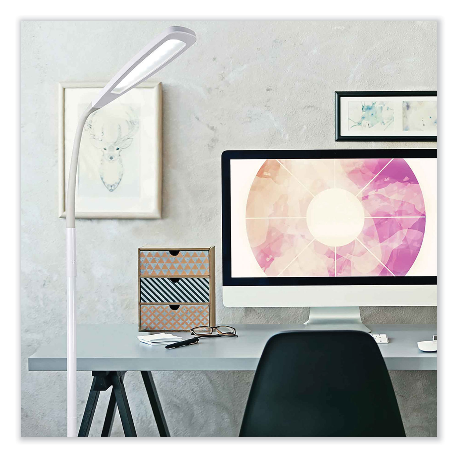 The natural daylight OttLite Flex LED Floor Lamp helps you see details clearly and colors accurately whether reading in your favorite chair or sewing in your sewing room. Exclusive ClearSun LED technology optimizes illumination while helping reduce eyestrain by 51%. With an expansive 12.5" shade and a rubberized flexible neck, you can direct the powerful OttLite ClearSun LED Illumination of this touch lamp right where you need it. With touch activated controls, you can adjust the brightness levels and the smart memory feature remembers your last brightness setting. This OttLite Flex LED Floor Lamp helps you see details clearly and reduces glare and eyestrain so you can do what you love, longer. Base Color: White; Plug Type: 2 Prong; Height: 49" to 71"; Width: 7.94".