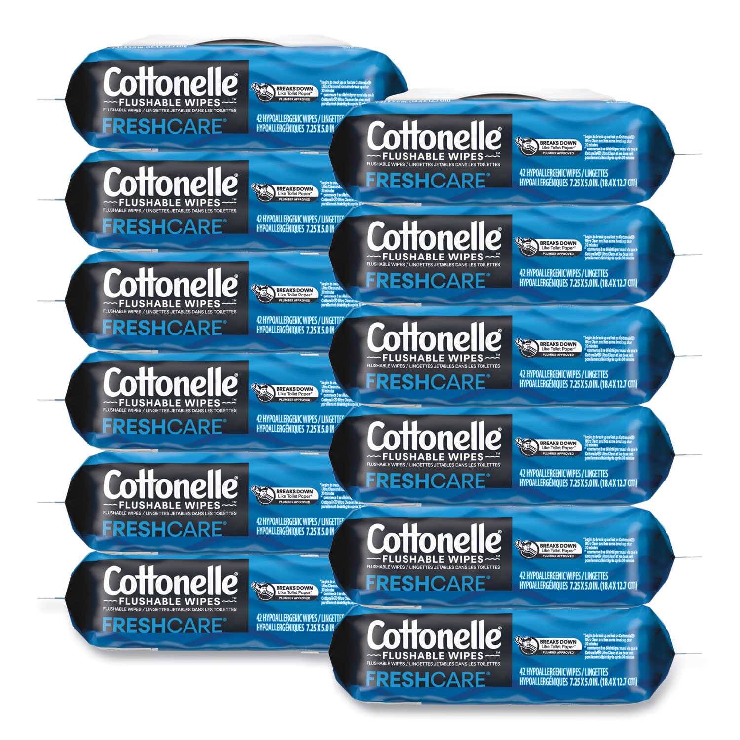 For a superior clean* that's fresh, gentle, and effective, choose Cottonelle® FreshCare Flushable Wipes with the CleaningRipples™ Texture. Cottonelle® bathroom wipes are 100% flushable, remove odor-causing bacteria and offer a large, dual layer wipe to clean better than when using dry toilet paper alone. These sanitary wipes are sewer-safe and septic-safe. *using dry + moist vs. dry toilet paper alone. Towel/Wipe Type: Flushable Wet Wipes; Applicable Material: Skin; Material(s): Paper; Number of Plies: 1.