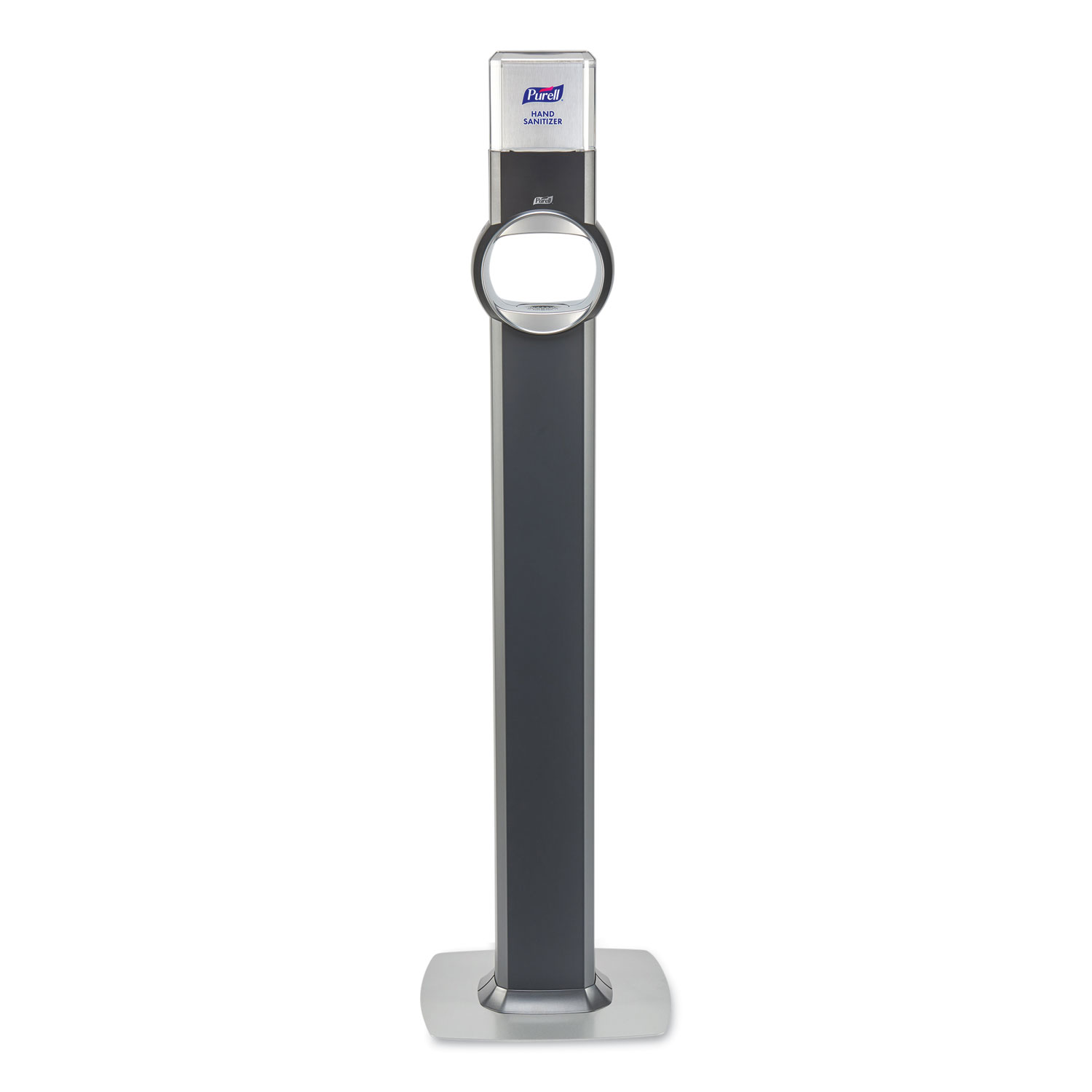 Premium, reliable touch-free dispenser stand for PURELL Hand Sanitizer. An elegant floor stand that reinforces high quality standards, while complimenting any décor. Includes Four "C" cell batteries—no tools required for replacing batteries. Multi-directional design unlocks new placement possibilities wherever hand hygiene is needed. Uses same AT-A-GLANCE™ refills as PURELL ES6, making it easy to monitor product levels with just one look. Seamlessly integrated tray to help maintain cleanliness. Low-profile baseplate maximizes stability and hides dirt. Mounting Details: Floor Stand; Holds: 1,200 mL; Material(s): ABS Plastic; Color(s): Graphite.