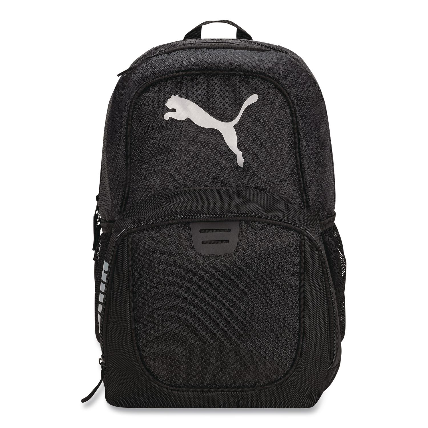 This PUMA heavy-duty backpack will get you through your toughest days with ease. A sturdy, textured poly exterior contains a variety of pockets and organizers within the roomy central compartment, so that your stuff stays safe protected, no matter the terrain you need to tackle. Color(s): Black; Color Family: Black; Material(s): Polyester; Carrying Handle: Yes.