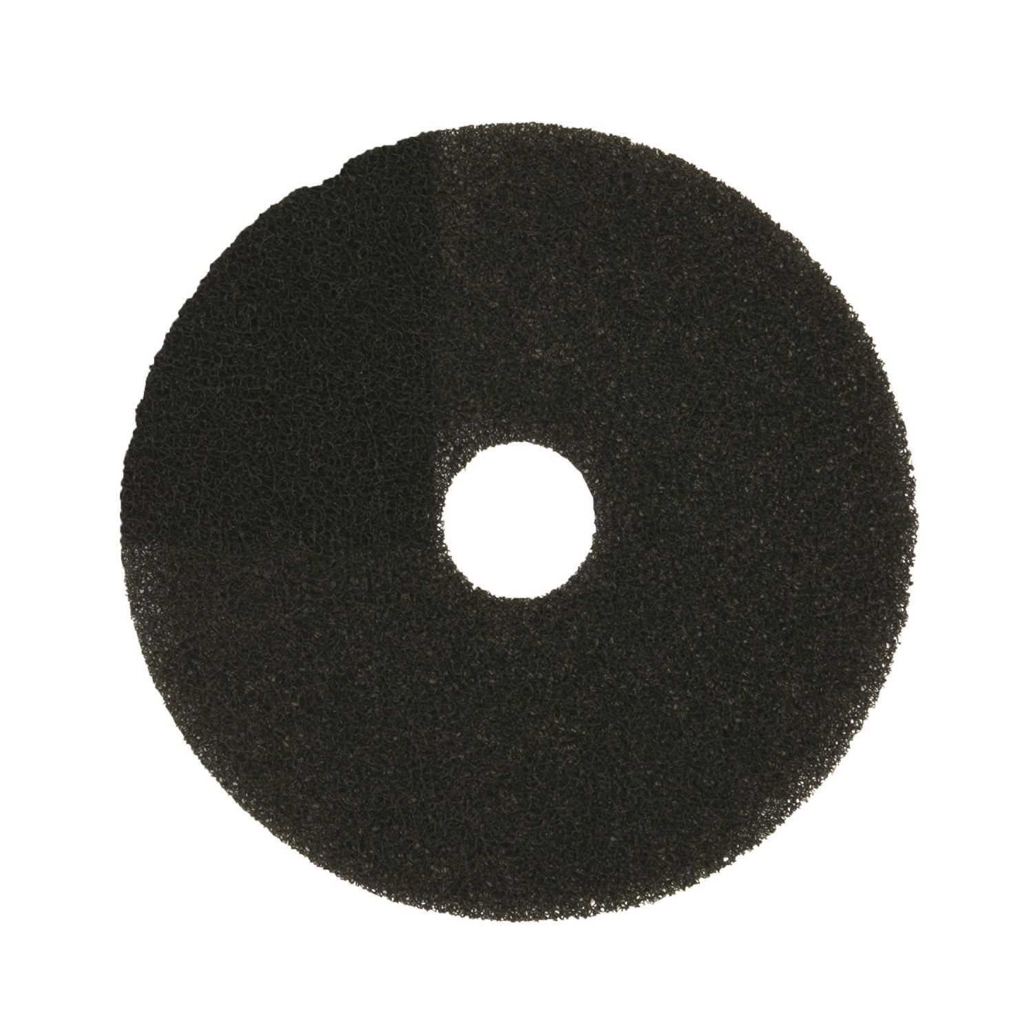 3M's most aggressive floor stripping pad, the 3M™ High Productivity Pad 7300, is the best choice for removing four or more coats of finish buildup from hard floors. The stripping pad's open construction allows stripping solution to circulate through the pad, reducing loading. Continuous nylon filaments, uniformly coated with resin and abrasive particles, provide consistently high performance throughout the life of the pad. For rotary and automatic floor machines. For optimum conformability and pad-to-floor contact, the pad can be backed with a red buffing pad. Floor Pads Application: Stripping; Diameter: 13"; Color(s): Black; Color Family: Black.