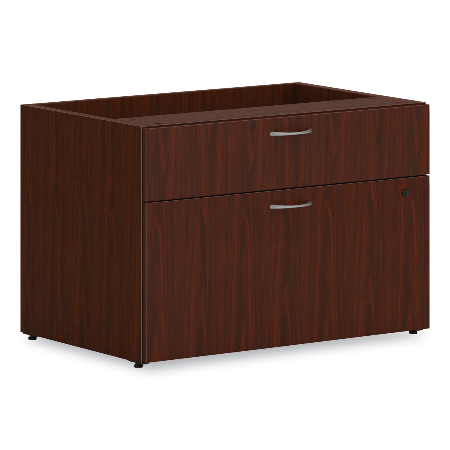 Steel ball-bearing drawer suspensions operate easily and quietly. Drawers are equipped with standard hangrails to hold either letter- or legal-width hanging files. Drawers open fully to give easy access to all contents. File folders are arranged side-to-side to take up less aisle space when drawers are opened. Leveling glides compensate for uneven floors. Color: Traditional Mahogany; Color Family: Mahogany; Pedestal Count: 0; Drawer Configuration: Box/File.
