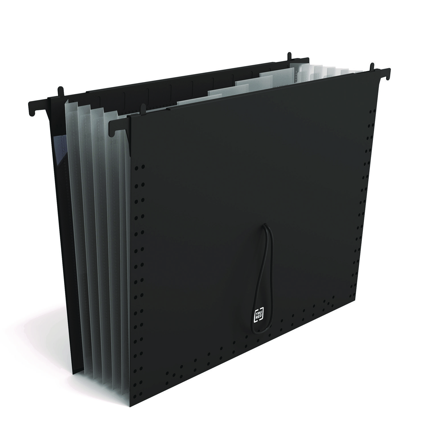 Protect and organize critical documents for fast retrieval with this TRU RED poly hanging file folder. The seven pockets offer support for further categorization options, while top tabs provide adequate space for labeling and help you locate projects easily. An expandable spine creates extra room for larger files. This TRU RED letter-size poly hanging file folder features a distinct color to help color-code your records by the client or subject. Folder Size Type: Letter; Folder Color: Black; Color Family: Black; Folder Material: Plastic.