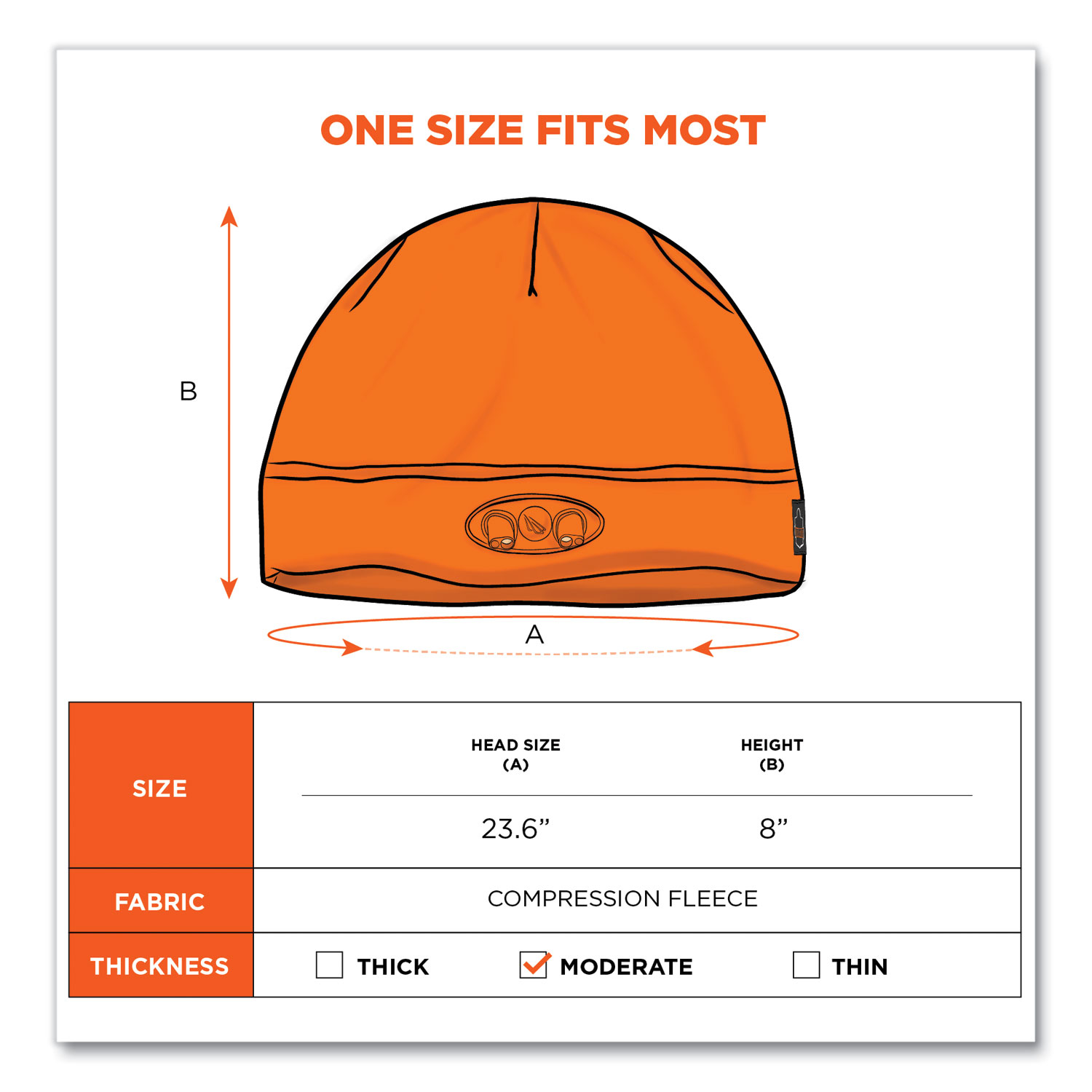 The N-Ferno 6804 Skull Cap Winter Hat with LED Lights is a premium compression knit beanie hat with four built-in dual-action LED lights, making it an ideal hands-free lighting solution for any cold weather situation. Simply click the button on the front of the skull cap hat to switch between two light settings—angled lights for close-up tasks and out lights for distance viewing up to 72 feet. With a 48-lumen output, this LED beanie is powerful yet low-profile enough for everyday wear. With up to 68-hours of runtime for each battery change, you'll always have visibility when you need it most. This knit winter hat is a great choice for winter weather. Soft compression fleece offers a snug fit, with heat-trapping warmth. Ideal for those who work outside, in low-light conditions, garages, warehouses and for those doing detailed work where extra light is needed. Apparel Type: Hat; Material(s): Fleece; Color(s): Orange; Color Family: Orange.