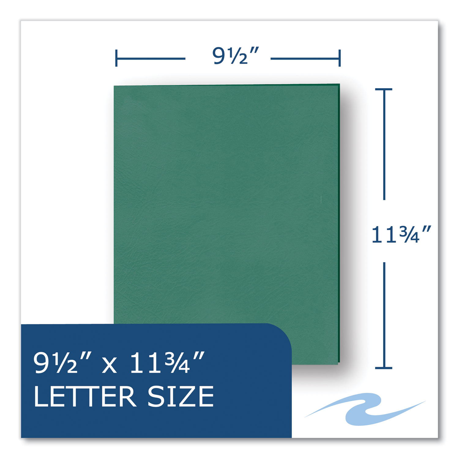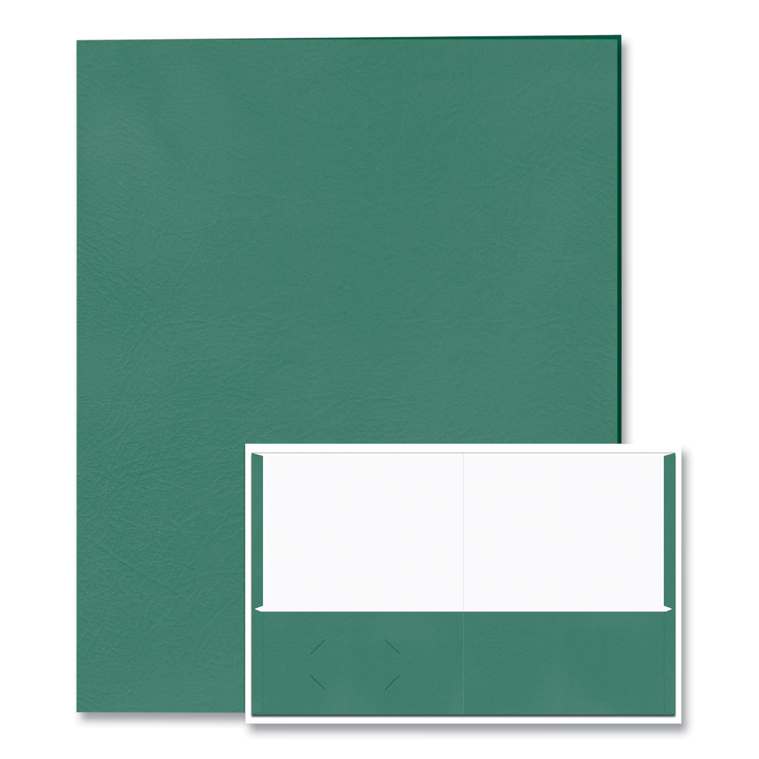 These folders have an embossed leatherette finish. The color is printed on durable white tag stock. Two inside pockets keep papers in place. Front Cover Color(s): Green; Color Family: Green; Back Cover Color(s): Green; Sheet Size: 11 x 8.5.