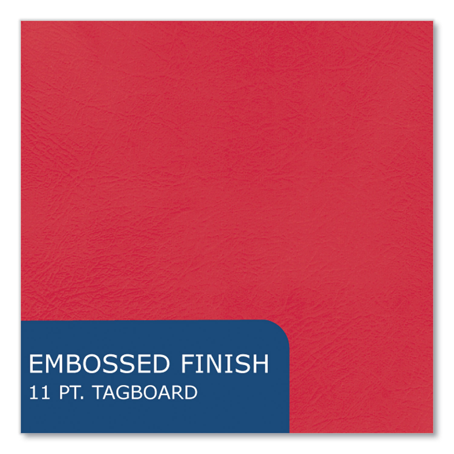 These folders have an embossed leatherette finish. The color is printed on durable white tag stock. Two inside pockets keep papers in place. Front Cover Color(s): Red; Color Family: Red; Back Cover Color(s): Red; Sheet Size: 11 x 8.5.