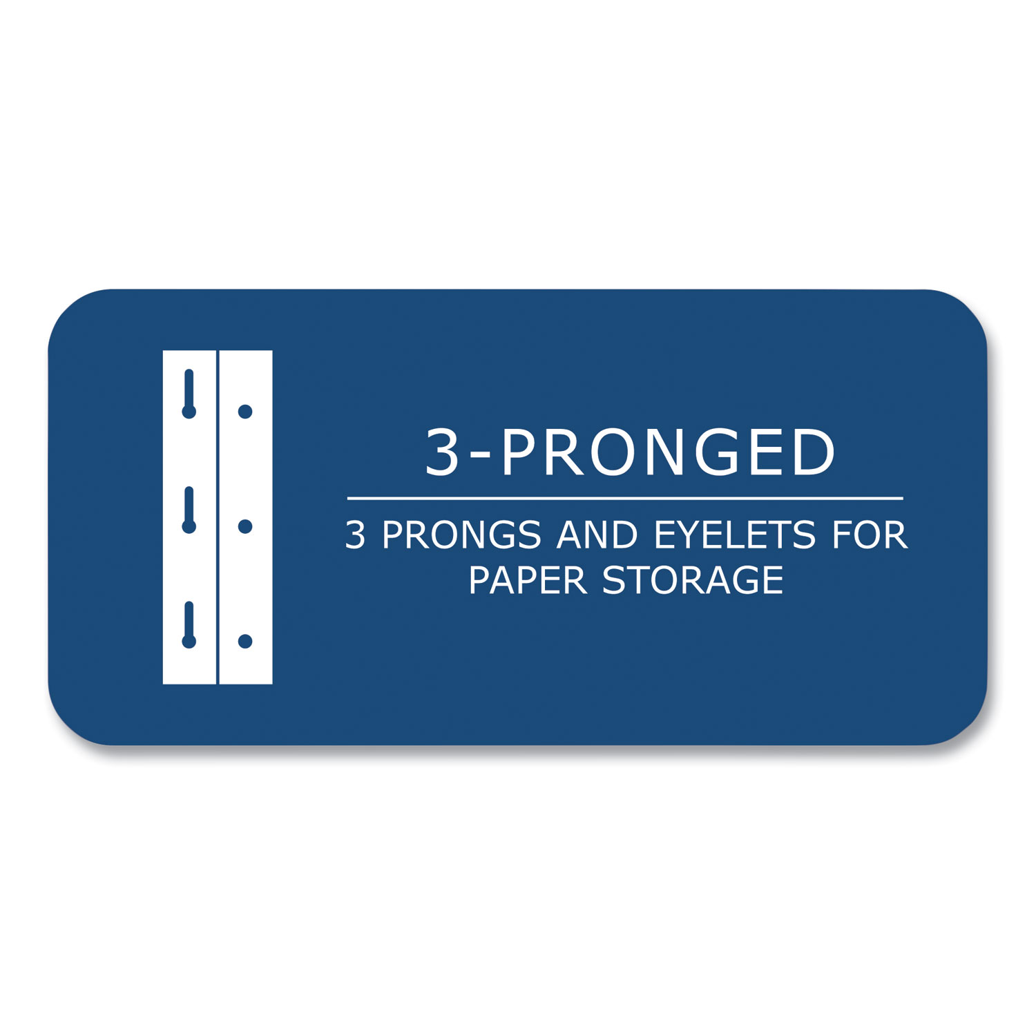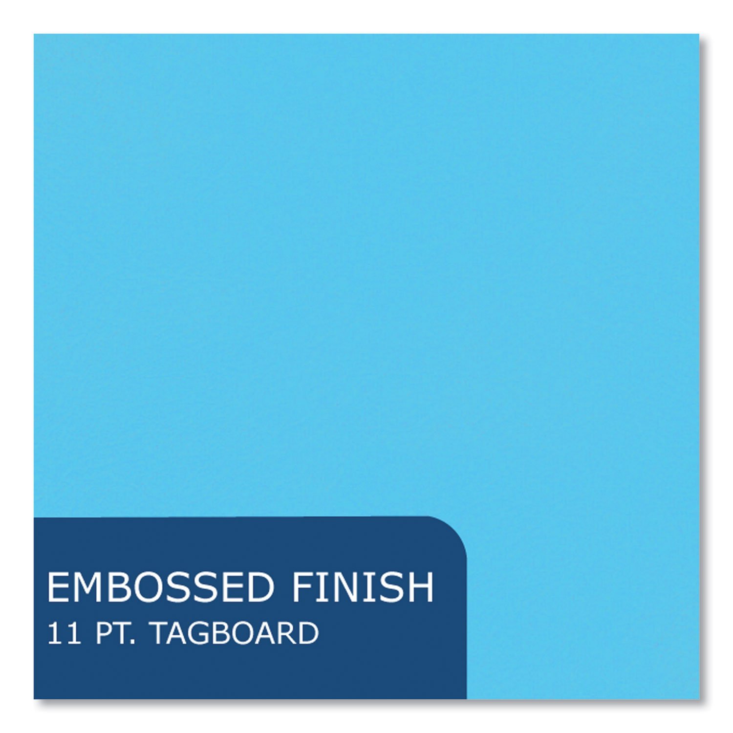 These folders have an embossed leatherette finish. Each folder has three prongs and eyelets for paper storage. Convenient inside pockets provide easy access. The color is printed on durable white tag stock. Colored outsides, inside surface is white. Front Cover Color(s): Light Blue; Color Family: Blue; Back Cover Color(s): Light Blue; Sheet Size: 11 x 8.5.