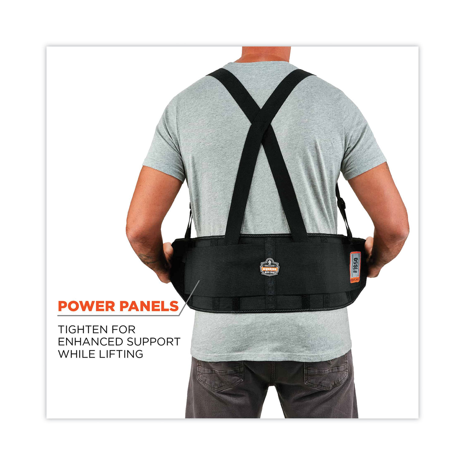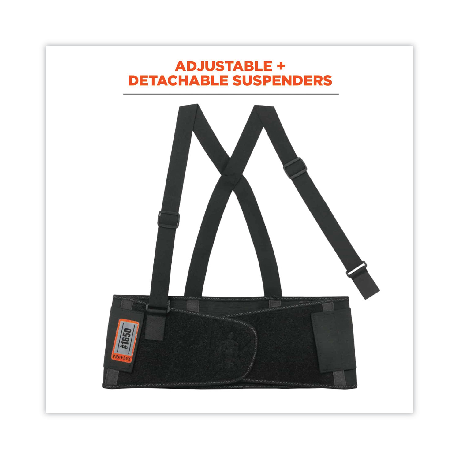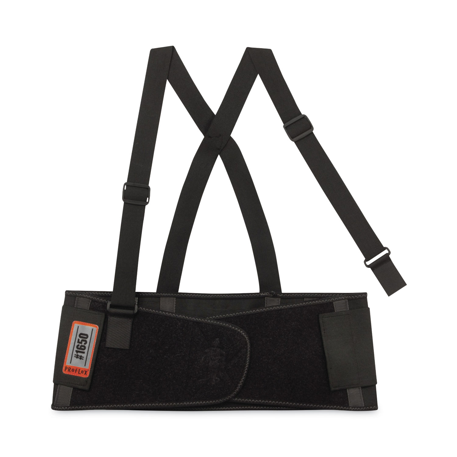 The ProFlex 1650 Economy Elastic Back Support Brace is designed to remind workers of proper lifting techniques while also enhancing the body's intra-abdominal pressure, moving the stress away from the spine for back-pain relief. Flexible, breathable all-elastic body with a 7.5" wide belt provides extra-firm support. Before lifting heavy objects, simply tighten the support belt to enhance the body’s intra-abdominal pressure; and after lifting, just loosen the belt to achieve a wider range of motion. Secure-fit, interior rubber-track webbing prevents the belt from riding up when bending or lifting. Innovative Power Panel Positioners keep the tension bands close-to-hand, making it easy to get the desired level of tension. Non-conductive polypropylene stays help ensure long-lasting integrity. Adjustable, detachable suspenders allow the wearer to tailor the shoulder-fit to his or her unique needs. For best results, the support should fit snugly around the wearer's hips, with the front of the support two-fingers below the wearer's navel. When worn correctly, workers can easily maintain the proper posture for lifting, while achieving the extra support required to safely complete the task. Easy-wear, 5" wide fastener strap with hook and loop closure keeps the belt securely fastened while in use. Brace can be worn over or underneath clothing. Machine washable—machine-wash cold and air dry. General Category: Work/Safety Gear; Sub-Category: Work Harness; Color(s): Black; Color Family: Black.