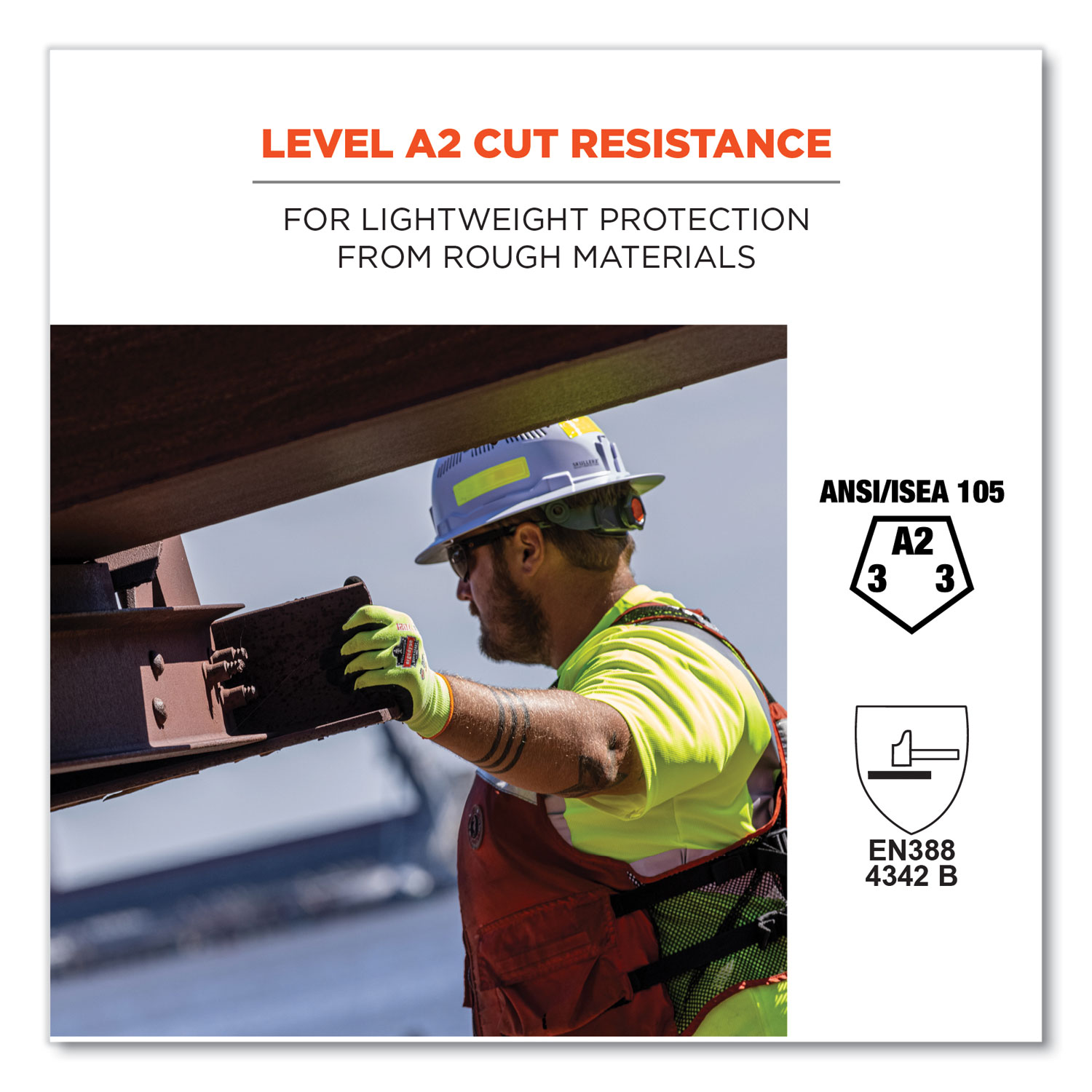 The ProFlex 7021 Nitrile Coated Gloves feature ANSI A2 cut protection for safety around sharp materials. Unlike other bulky cut-resistant gloves, the 18-gauge HPPE nylon-spandex knit protects hands while maintaining a soft, lightweight and flexible form fit. The snug knit cuffs are longer than most on the market, a feature that enhances fit and extends protection while keeping dirt and debris out. Coated in WSX nitrile, (W)et (S)urface E(X)treme, these utility work gloves are designed for optimal performance when handling wet or oily materials and surfaces. To prevent hands from overheating, they are first dipped in a water-based PU coating that wicks sweat and allows airflow to pass through. Then, they are dipped in an innovative anti-slip sandy nitrile designed to absorb and disperse liquids from the surface. Style: Coated; Wrist Style: Knit Cuff; Material(s): HPPE Nylon-Spandex Knit; Polyurethane; WSX Nitrile; Thumb Style: Straight.