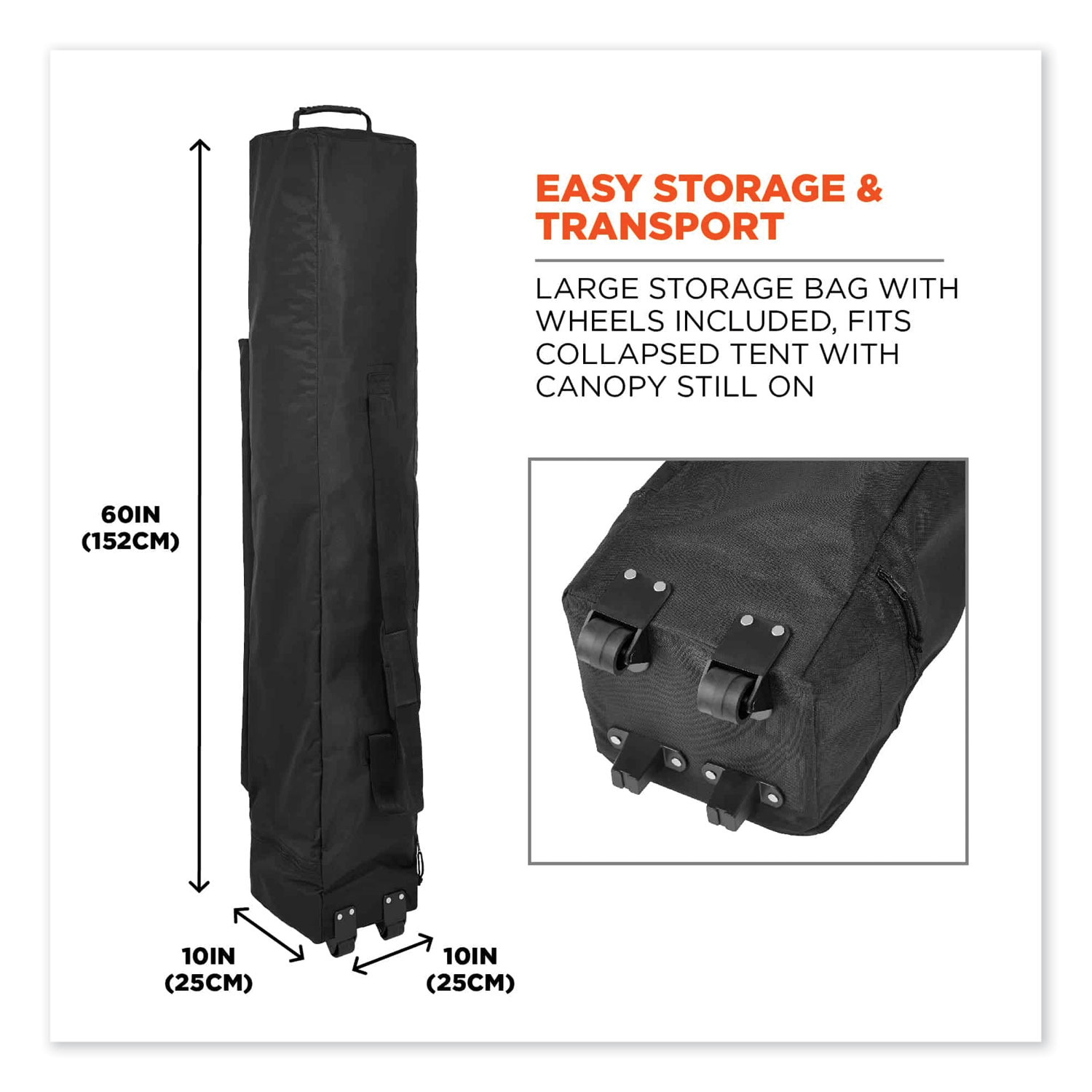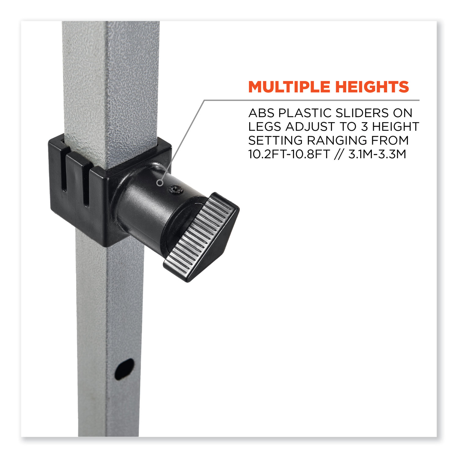 The SHAX 6000 Heavy-Duty Pop-Up Tent is a durable instant shelter providing fast, long-lasting relief from the sun, wind, and rain, with a 10 ft x 10 ft footprint. The powder-coated steel frame is built to withstand the elements and wont easily bend or rust like aluminum. ABS plastic sliders on the adjustable legs are more durable and easier to adjust compared to other tents that have push-pins. This portable tent offers three different heights ranging from 10.2 ft to 10.8 ft. Made with thick, high-quality 300D polyester material, this heavy-duty 10 ft x 10 ft canopy also boasts waterproofing polyurethane coating (PU) and UV treatment as well as reinforced corners to withstand tough conditions. A double-vented top allows maximum air flow, while a silver reflective coating on the interior provide increased visibility on busy job sites or at events. Type: Gazebo; Style: Pop-Up; Wall Design: Single Skin; Outer Dimensions: 10 ft x 10 ft.