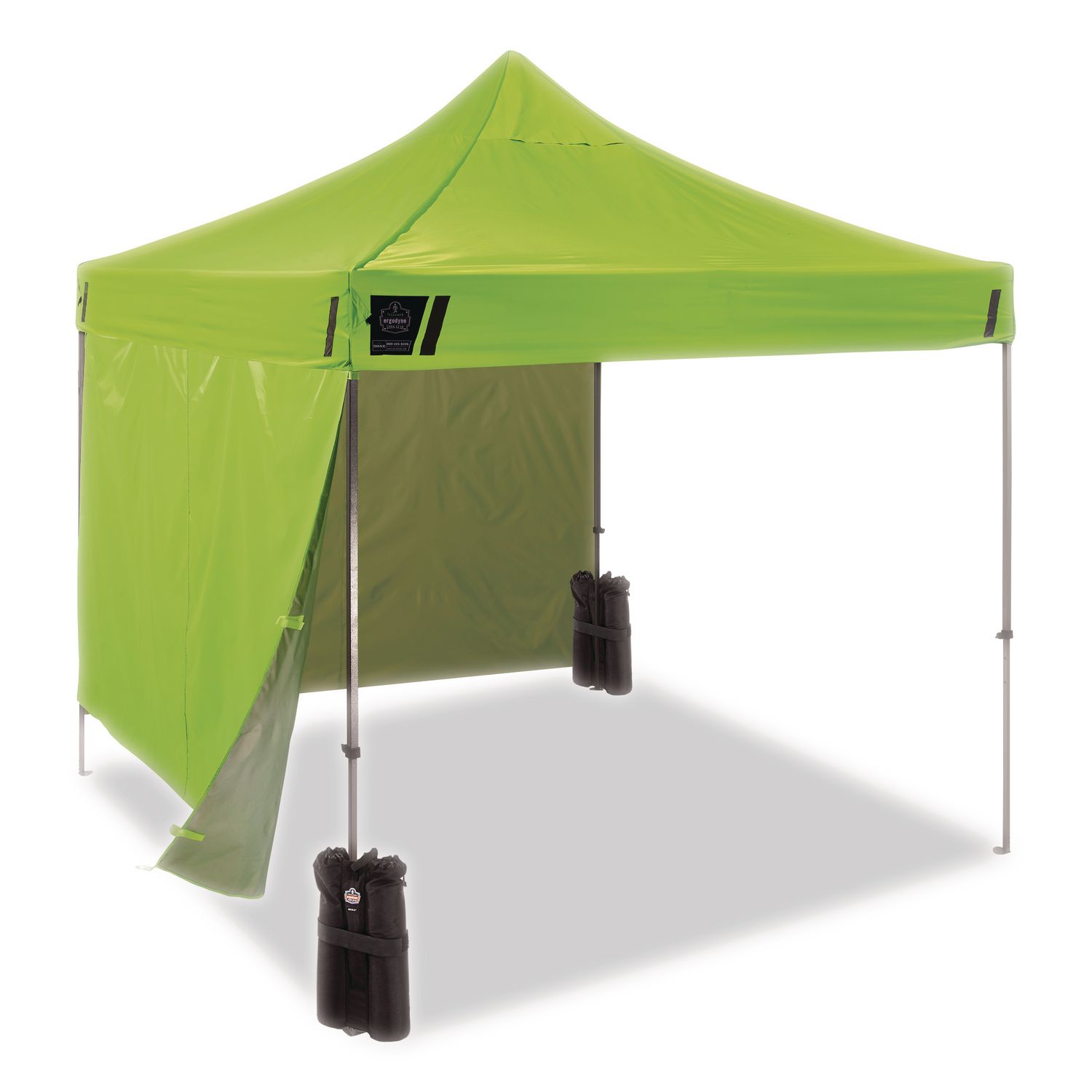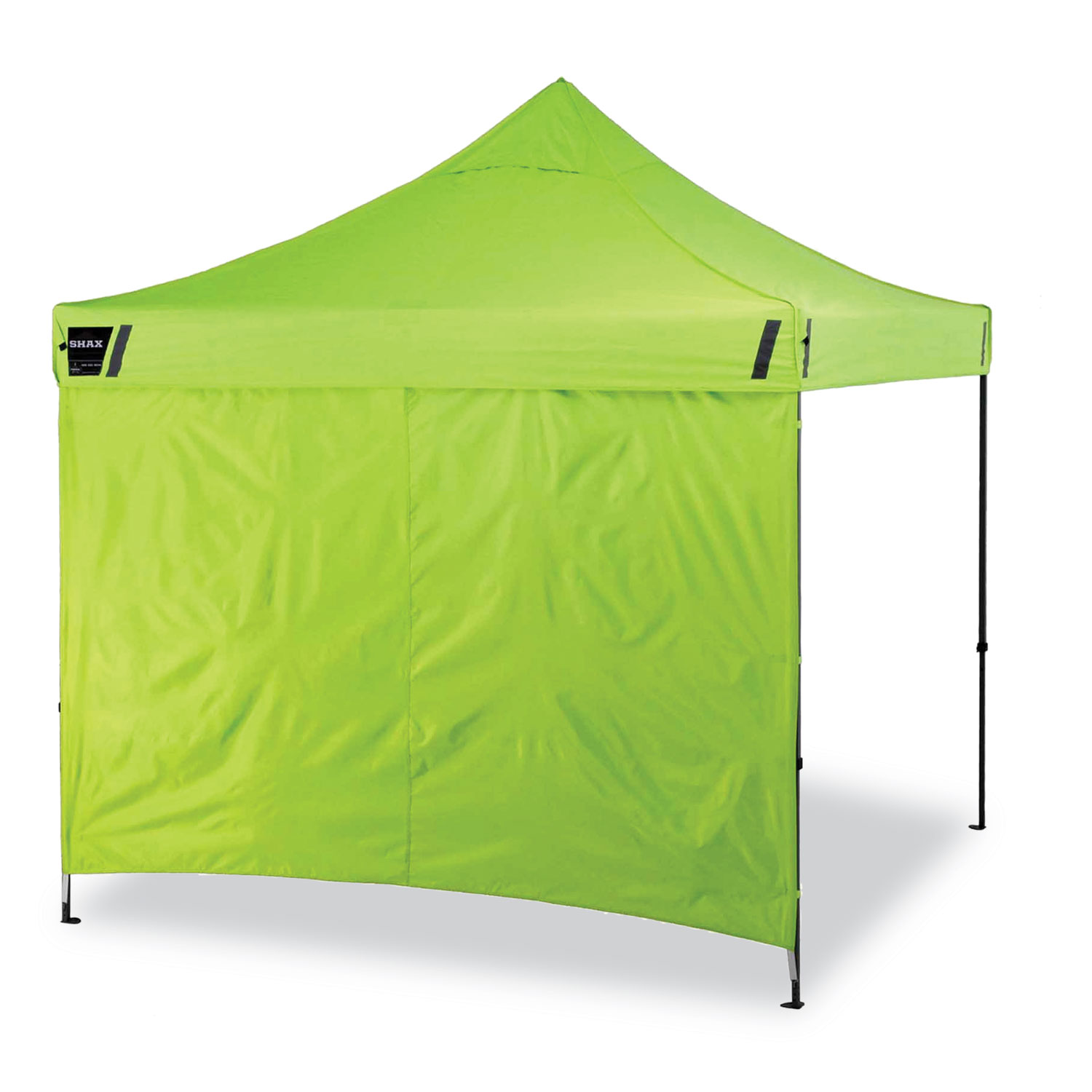 The SHAX 6051 Heavy-Duty Pop-Up Tent Kit is a durable portable shelter providing fast, long-lasting relief from the sun, wind, and rain with a 10 ft x 10 ft footprint. It includes one tent, two detachable side panels, two weight bags and a carrying bag. The weight bags can be quickly and easily filled with dirt or sand and placed around opposite legs of the tent to provide extra security on windy days. The powder-coated steel frame is built to withstand the elements and wont easily bend or rust like aluminum. ABS plastic sliders on the adjustable legs are more durable and easier to adjust compared to other tents that have push-pins. This portable tent offers three different heights ranging from 10 ft to 14 ft. Made with thick, high-quality 300-denier polyester material, this heavy-duty 10 ft x 10 ft canopy also boasts waterproofing polyurethane coating (PU) and UV treatment as well as reinforced corners to withstand tough conditions. Type: Gazebo; Style: Pop-Up; Wall Design: Single Skin; Outer Dimensions: 10 ft x 10 ft.