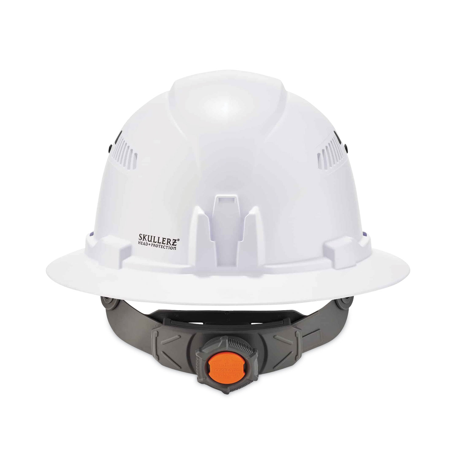 The Skullerz 8973 Class C Full Brim Hard Hat and LED Light is heavy-duty, yet lightweight and comfortable head protection built to protect the top of the head from falling objects or bumping into stationary objects. A padded, moisture-wicking and odor-resistant sweatband and top pad lines the sides, forehead and top interior and is removable for easy replacement. This full-brim style helps keeps rain away from the eyes and provides extra protection against falling or flying debris. Also offers all-around protection from the sun, humidity and heat. The open frame design with the adjustable venting offers a cooler hard hat in the heat and a dry hard hat in the rain. This safety helmet fits hat sizes 6.5 to 8 (21 in to 25 in). Customize the size with the easy-to-adjust 4-point premium ratcheting suspension. Simply turn the one-handed adjustment knob to tighten or loosen the fit without having to take the hard hat off. Style: Full Brim; Material(s): PC ABS; Adjusting Method: Ratchet; Thickness: 5 mm.