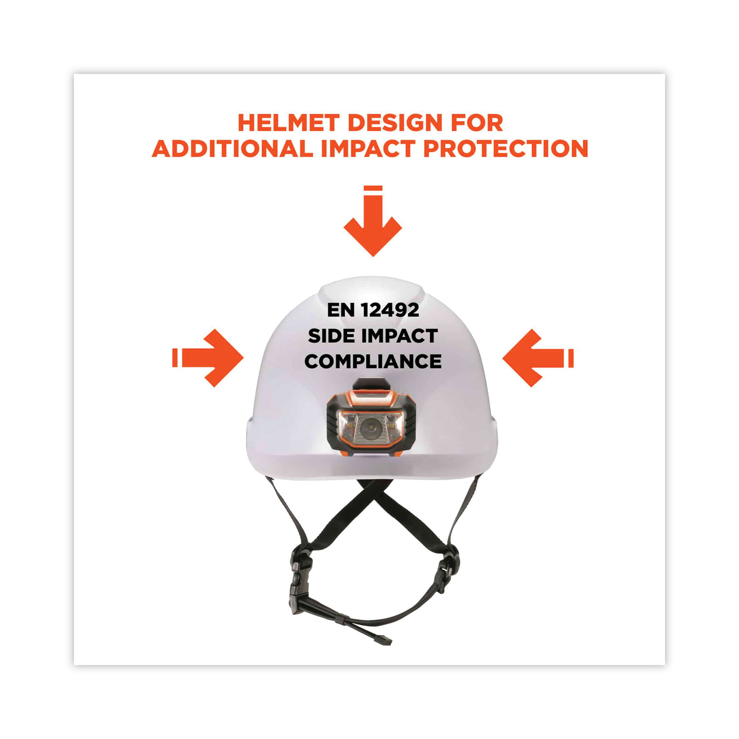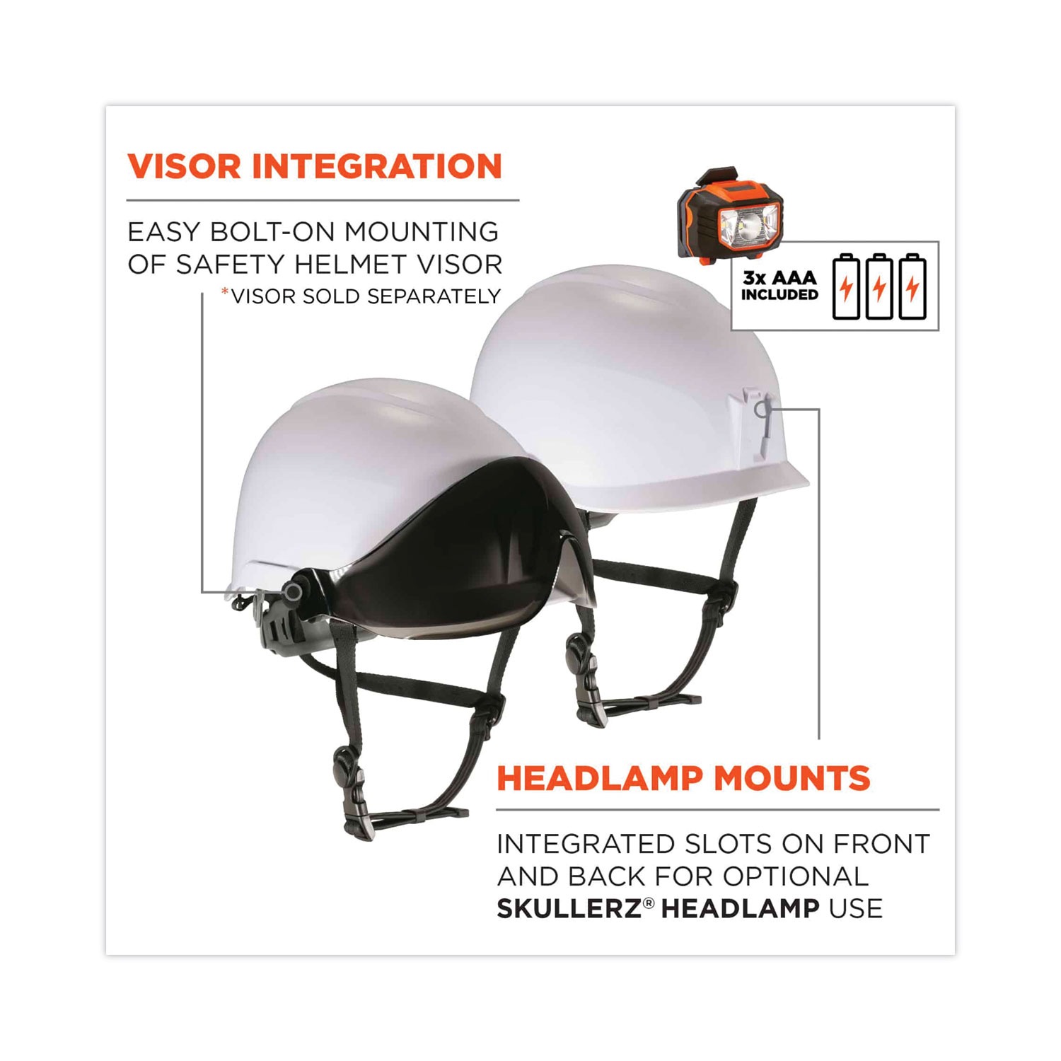 The Skullerz 8974LED Class E (Electrical) Safety Helmet features a dielectric shell and a six-point suspension system to provide heavy-duty, yet lightweight and comfortable, all-over-head protection from top, side, front and back impacts as well as high-voltage system contacts. Its smaller, low-profile brim helps improve overall field of vision, particularly when looking up, and patent-pending headlamp slots on the front and rear of the exterior accommodate Skullerz Hard Hat Headlamps. One Skullerz 8981 Universal LED Headlamp is included to help you keep your path and the object of your attention illuminated. The helmet's flexible, open-frame, multi-point adjustable-suspension design maximizes airflow for breathable, all-day wearing comfort, and a one-size-fits-most format accommodates those who wear hat sizes 6.5 through 8. A premium, easy-adjust ratcheting system allows the wearer to tighten or loosen the fit without having to take the helmet off, and its one-handed fit-adjustment knob pivots to improve overall ergonomics while providing extra clearance for bandana or ponytail knots. A padded, moisture-wicking, odor-resistant sweatband and top pad line the sides, forehead and top of the interior, and both the headband and top pad are removable for machine-washing and/or easy replacement. An integrated chin strap allows the wearer to secure the helmet in place to ensure protection during sudden movements, falls and impacts. Built with even weight-distribution and comfort in mind, all Skullerz 8974 helmets should deliver a snug, balanced fit to please nearly anyone. For jobs where increased eye protection is needed, the helmet also accommodates easy, bolt-on mounting of Skullerz Safety Helmet Visors (visors sold separately). From mountain-climbers to miners, from communication-tower technicians to pipefitters... whether you're on top of the world or deep within it, 8974 series safety helmets are designed to help you keep your head. Style: Front-Bill Cap; Material(s): PC ABS; Adjusting Method: Ratchet; Thickness: 5 mm.