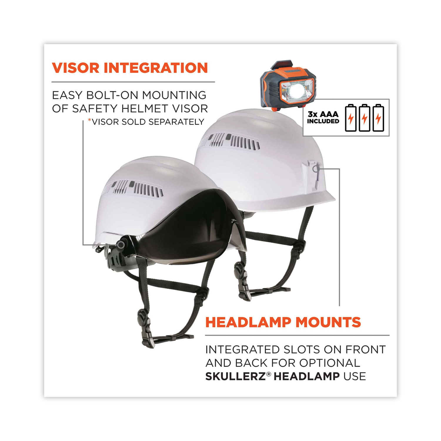 The Skullerz 8975LED Class C (Conductive) Safety Helmet with LED Headlamp features a unique, vented shell and a flexible, open-frame, six-point suspension system to provide heavy-duty, yet lightweight and comfortable, all-over-head protection from top, side, front and back impacts. Integrated, patent-pending headlamp slots on the front and rear of the exterior accommodate Skullerz Hard Hat Headlamps, and one Skullerz 8981 Universal LED Headlamp is included to help you keep your path and the object of your attention illuminated. Adjustable exterior venting allows the wearer to remain cool in hot, dry weather by opening the vents or to remain warm and dry in cold, wet weather by closing the vents. The compact shell's smaller, low-profile brim helps improve overall field of vision, particularly when looking up, and a one-size-fits-most format accommodates those who wear hat sizes 6.5 through 8. A premium, easy-adjust ratcheting system allows the user to tighten or loosen the fit without having to take the helmet off, and the rachet system's one-handed adjustment knob pivots to improve overall ergonomics while providing extra clearance for bandana or ponytail knots. A padded, moisture-wicking, odor-resistant sweatband and top pad line the sides, forehead and top of the interior, and both the headband and top pad are removable for machine-washing and/or easy replacement. An integrated chin strap allows the user to secure the helmet in place to ensure protection during sudden movements, falls and impacts. Built with even weight-distribution and comfort in mind, all Skullerz 8975 helmets should deliver a snug, balanced fit to please nearly anyone. For jobs where increased eye protection is needed, the helmet also accommodates easy, bolt-on mounting of Skullerz Safety Helmet Visors (visors sold separately). From mountain-climbers to spelunkers, from iron-workers to pipefitters... whether you're on top of the world or deep within it, 8975 series safety helmets are designed to help you keep your head. Style: Front-Bill Cap; Material(s): PC ABS; Adjusting Method: Ratchet; Thickness: 5 mm.