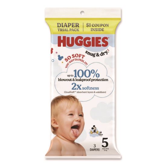 Our new Snug & Dry diapers are designed with 2x softness: CloudSoft absorbent layers and waistband and a curved and stretchy fit. With Snug & Dry baby diapers, you can bring up to 100% leak and blowout protection to your diapering routine. Made with the original Leak Lock blowout blocker, Snug & Dry baby diapers help provide up to 100% leak proof and blowout protection. As the only leading brand that is entirely fragrance free, Snug & Dry disposable diapers are free of fragrances and elemental chlorine. They are also made without lotions and natural rubber latex. To better alert you when a diaper change is needed, the wetness indicator on Snug & Dry baby diapers changes color when wet. Diapers feature exclusive Disney designs. Diaper Style: Disposable; Diaper Size: 5; Baby Weight Range Max [Max]: Over 27 lbs; Latex Free: Yes.
