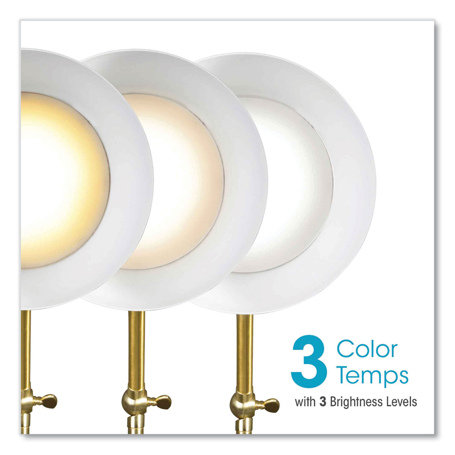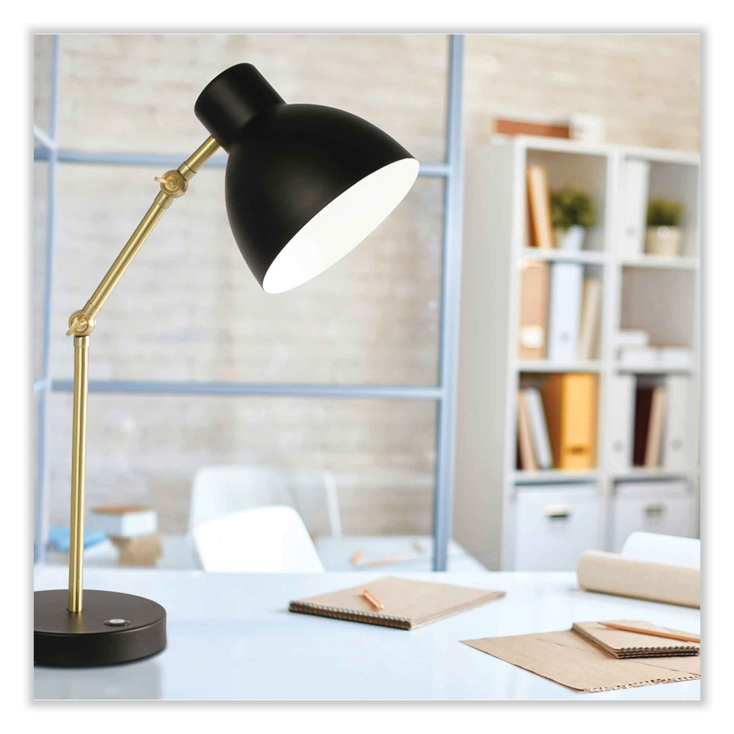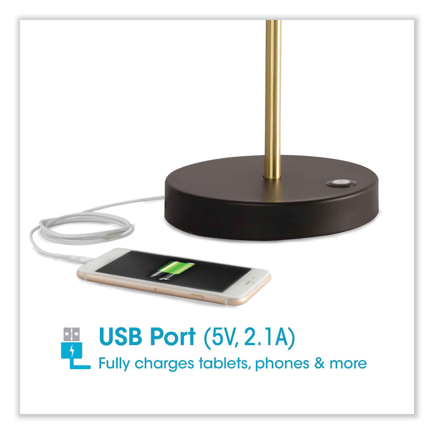 With bold brushed brass accents and matte black finish, the Adapt LED Desk Lamp makes being stylish a healthy decision. That's because this lamp features OttLite ClearSun LED technology--proven to reduce eyestrain by up to 51%. This exclusive LED comes as close to the sun's spectral output as you can get, helping you see details with incredible clarity and comfort. You can also select from two other color temperatures and three brightness levels with the touch sensitive button. The lamp also offers two locking joints to direct illumination and a USB port to fully charge your devices. Base Color: Black; Plug Type: Type A; Height: 7" to 22"; Width: 6".